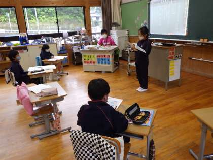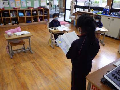 3・4年生国語。登場人物の気持ちになりきって音読していました。