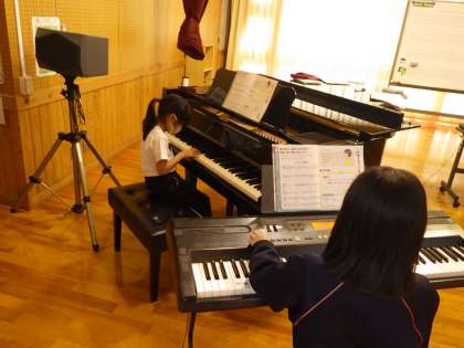 3・4年生音楽。鍵盤ハーモニカが使えませんので、キーボードを使用します。本校は1人1台使えます。
