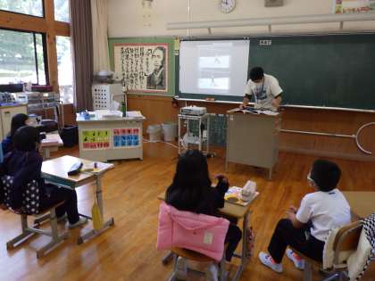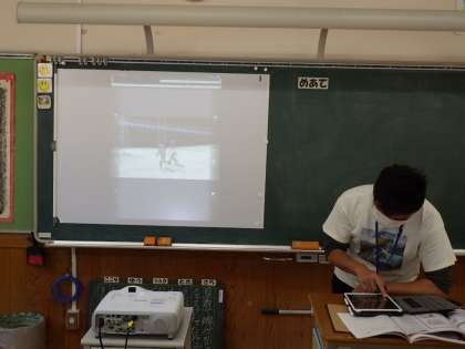 3・4年生体育。タブレットで撮影した動画で、投げ方を比較することができます。映像を重ねたり、並べたりできます。有効に活用していますね。