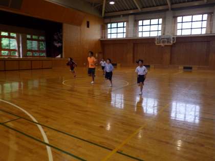 5・6年生体育。体力テストが行われますが、5年生がシャトルラン初体験なので、練習をします。