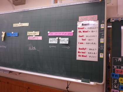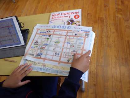 5・6年生外国語科。方角を示す英語を、実際のガイドマップを使用し英語で話します。自分のお気に入りの食べ物屋さんを英語で道案内するそうです。