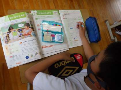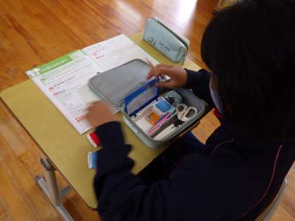 5・6年生家庭科。5年生は新品です。今時の裁縫セットの鞄はおしゃれですね。