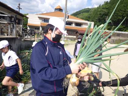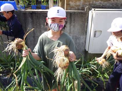 学校の畑に植えていたタマネギの収穫を迎えました。子どもたちが抜きました。