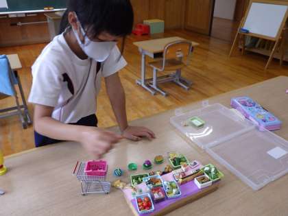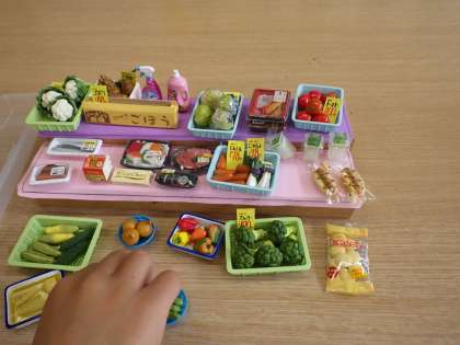 やまびこ学級。一つ一つ精巧にできているミニチュアで買い物遊びをします。