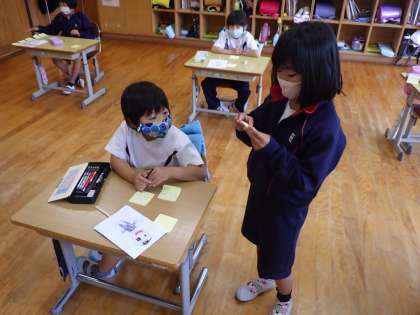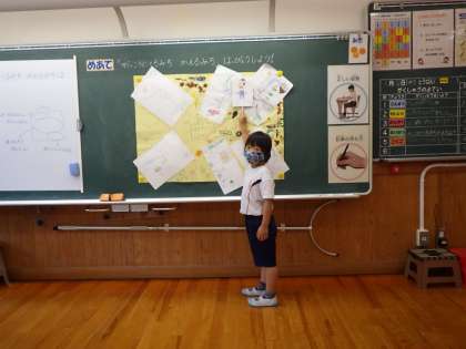 1・2年生活科。自分で作ったペープサートで、通学路の紹介をしています。