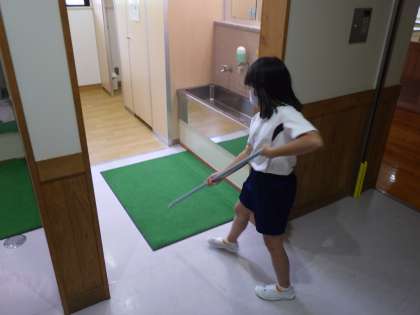 4年生算数。身近なもので並行や垂直を調べます。女子トイレのマットで垂直や平行を説明していましたが、男の子は若干戸惑っていました。