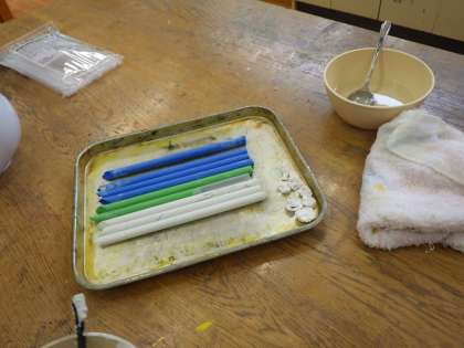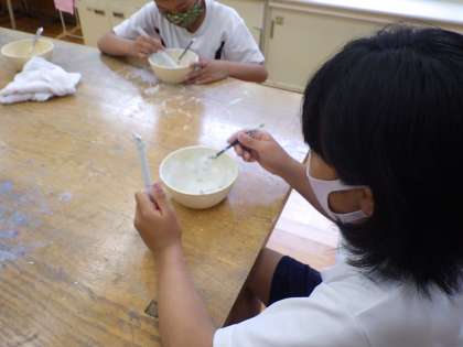 5・6年総合。短くなって捨てるチョークを作り直しています。