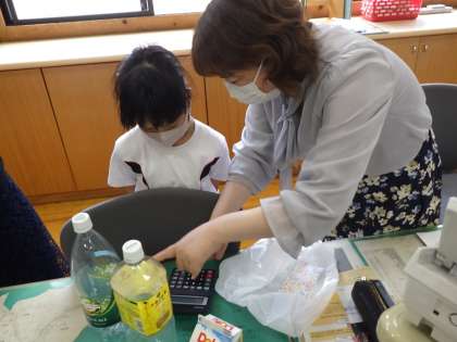 やまびこ学級。先生にたのまれたお使いを届けにきました。計算機で確かめてみます。