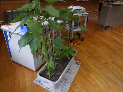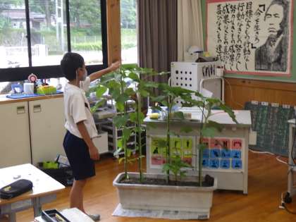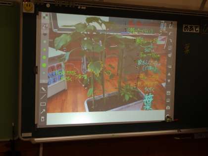 3・4年生理科。植物を写真で撮影し、プロジェクタに投影し、そこに気づいたことを書きこんでいます。