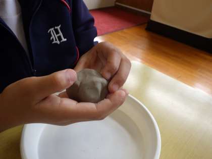 1・2年生。講師の方2名をお招きして、どろだんごをつくりました。