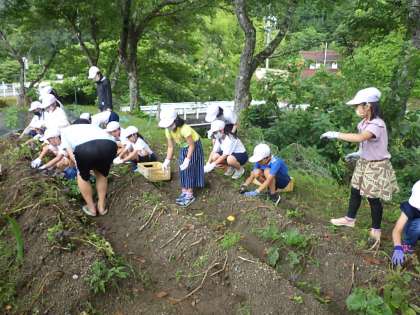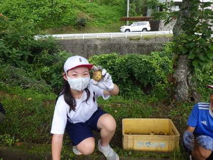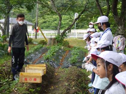 学校の畑で栽培していたジャガイモを全校で収穫しました。