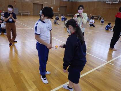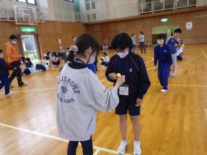 午後の活動は体育館でレクリエーションです。ピンポン玉リレーかな?