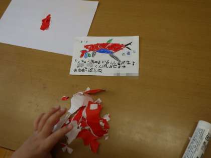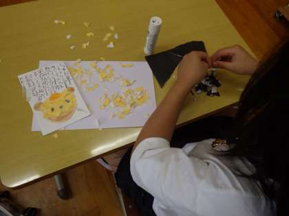 1・2年生生活科。貼り絵や綿棒を使用しての点描画など工夫されています。もらったらさぞかしうれしいでしょうね。