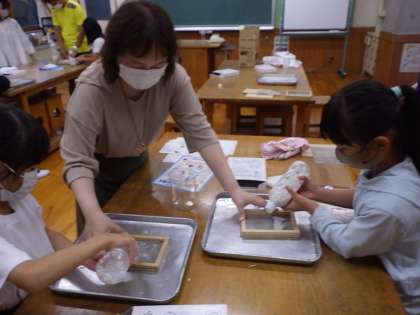 どろどりになった繊維を今度は型に押し込み、上から押して水分を取り除きます。