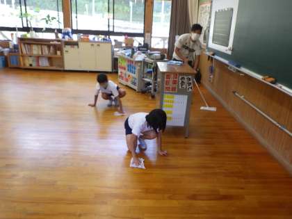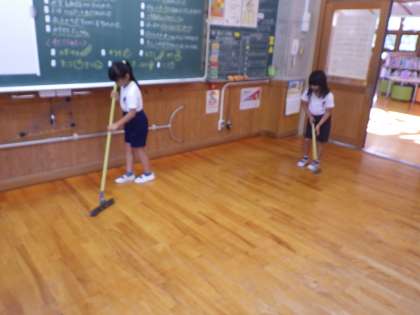 感染症対策のため、今まで縦割り班で行っていた清掃活動を、学級単位にします。また、最少人数で間隔を保ちながら行っています。