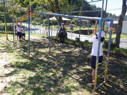 1・2年生体育。2組に分かれ、ぶら下がりながら足でジャンケンをします。負けたら次の子に交代・・・勝ち続けた方がつらい気もします・・・