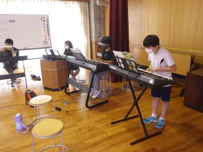 5・6年生音楽。伴奏者に合わせて、それぞれのパートで演奏します。アイパッドのボイスレコーダー機能を使いふりかえります。