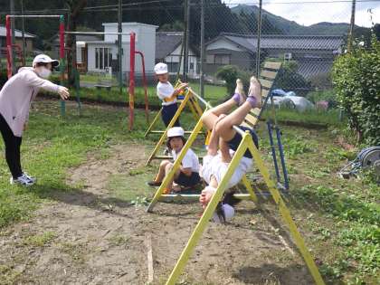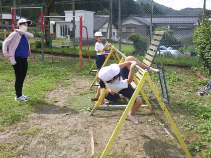 1・2年体育。1年生の子にぶら下がり方を教えています。