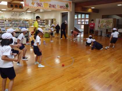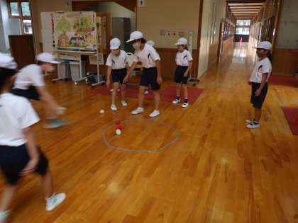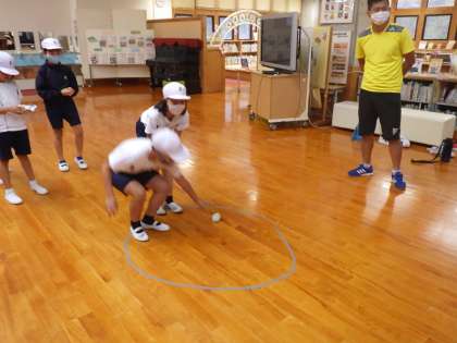 みんなで楽しく体を動かしました。これはボッチャですね。
