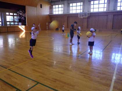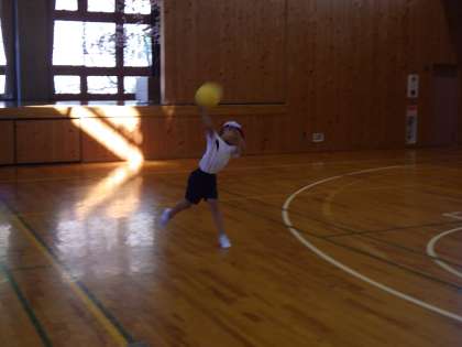 1・2年生体育。下の写真の子は、投げ方がとても様になっています。