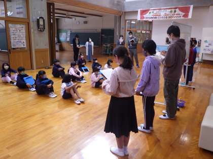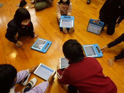 全校遊び。5・6年生が考えた遊びです。お題に対して同じ答えを書いたら得点です。タブレットを使っています。