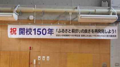 上:150周年を記念し、横断幕を作成しました。本校は選挙の投票会場となりますので、選挙に来る方々に知ってもらうのによい機会です。