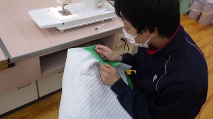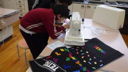 5・6年家庭科。6年生はナップサックを作っています。5年生はランチョンマット。
