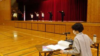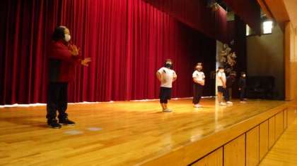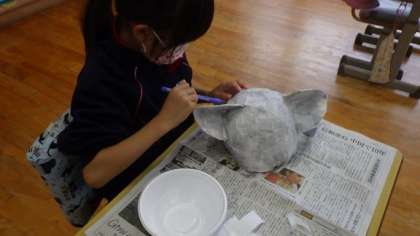 1・2年劇。体育館で音楽付きで練習をしています。下は、その劇で使うじかぶり物を自分たちで作っています。