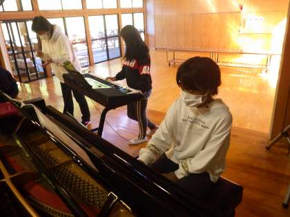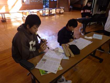 5・6年生音楽。パート練習の次は合奏です。リズムを合わせて演奏しています。