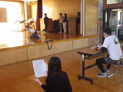 3・4年生劇。校内にある小舞台で練習します。