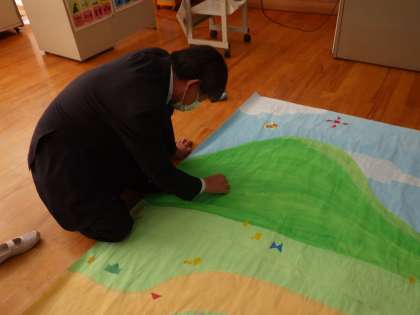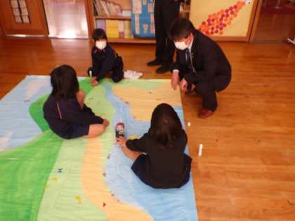 豊田市教育委員会教育長の山本様が訪問され、この授業を参観されました。子どもたちと一緒にドリームサンドづくりに参加してくださいました。