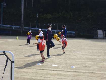 名古屋グランパスエイトのコーチ3名がいらっしゃり、楽しくサッカーを教えてくださいました。これは1・2年生です。