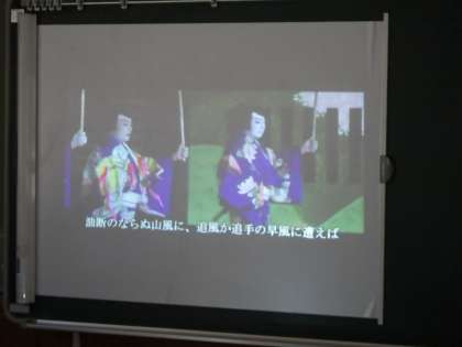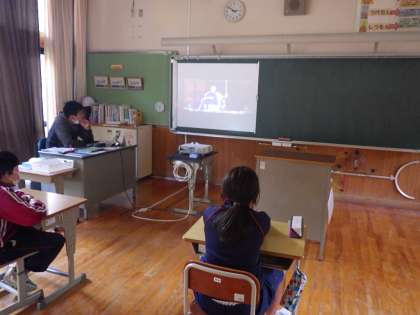 5・6年生。子供歌舞伎で行う「五人男」を実際の歌舞伎役者が行っているビデオを見ています。