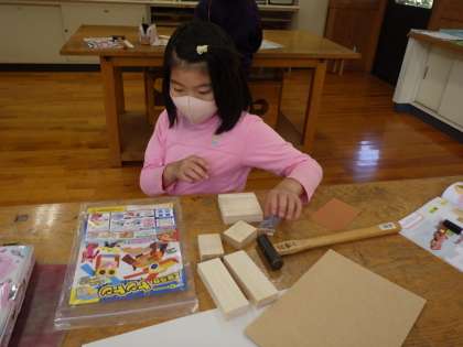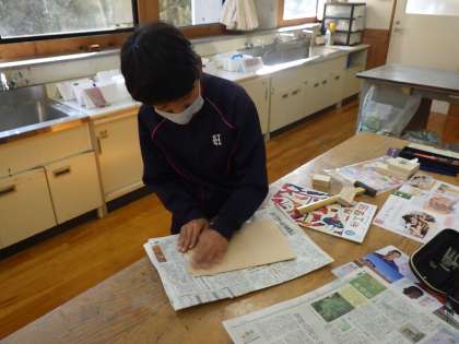 3・4年生図工。きれいにパーツをやすりで整えてから組み立てます。