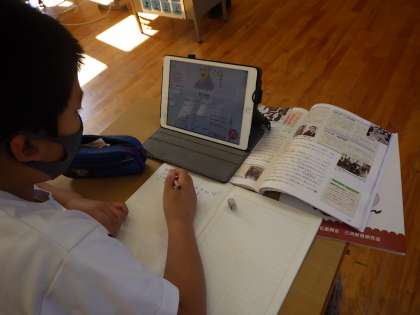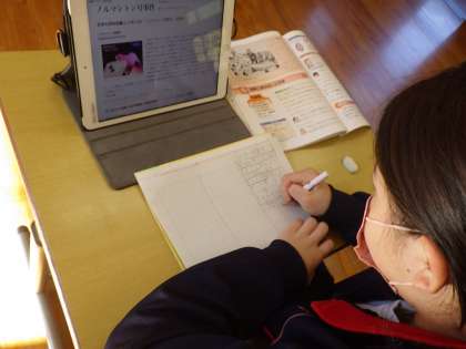 5・6年社会。富国強兵策などを調べます。タブレットの情報を整理してノートに書き残します。