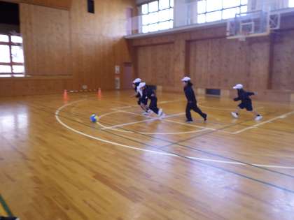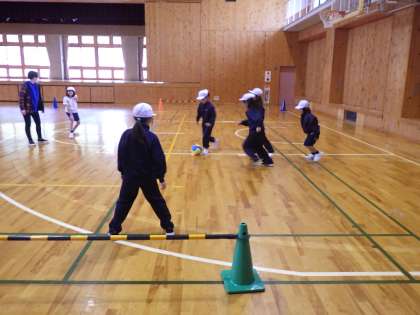 1・2年生体育。3対3の小さなボールけり遊びです。
