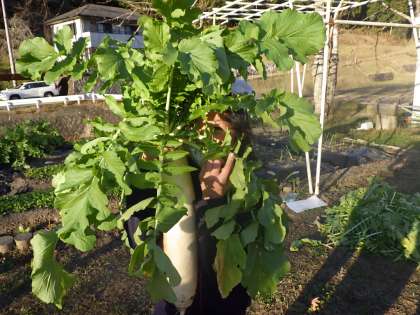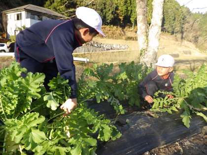 本校の畑に大根ができ、児童が収穫しました。 豊作です。
