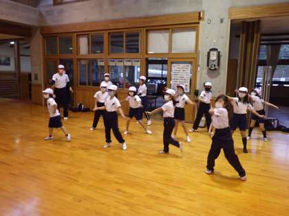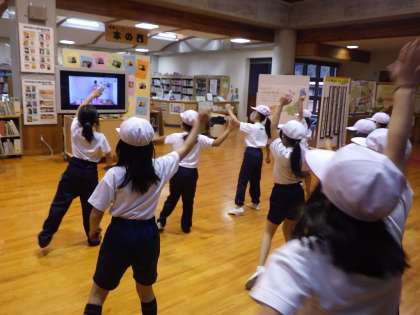 業間マラソン(らんらんラン)は雨のため、ホールにてダンスを行いました。