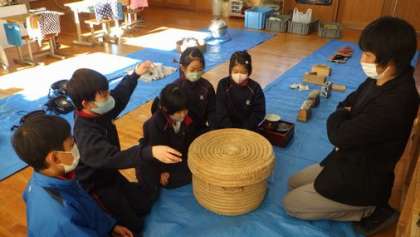 3・4年生社会。郷土資料館の方が、昔の道具を持ってきて出前授業をしてくださいました。実物を見てどのように使っていたのか子どもたちは興味津々です。