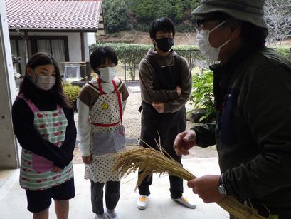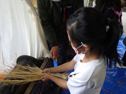 地域共働本部のコーディネーターさんが、脱穀機やそれらを扱うため、地区からお手伝いしてくださる方をよんで、一緒に稲の脱穀をしました。