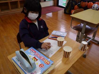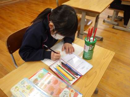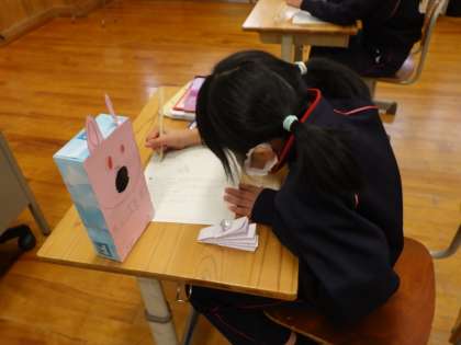 2年生国語。昨日作成していたおもちゃが完成しました。その説明をまとめています。