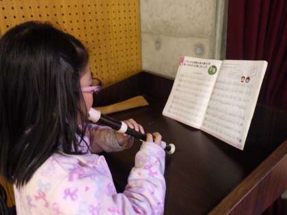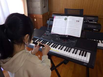 3・4年音楽。 広い音楽室の角でそれぞれで練習しています。