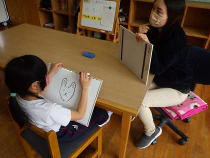 描いた絵に対して互いに質問をし、当てます。