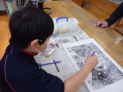 5・6年生図工 本校の伝統行事子供歌舞伎を題材にしています。 歌舞伎は「映え」ますね