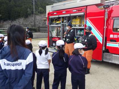 避難訓練で足助消防署から消防車が来てくれました。