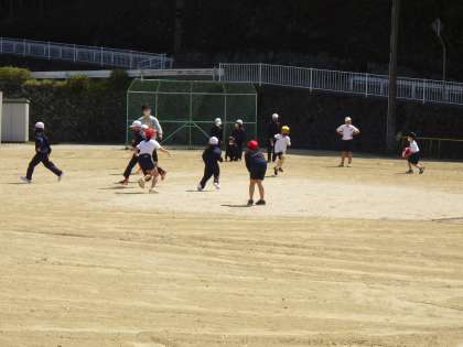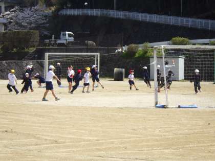 今日はとても天気がいいので、全校で運動場で遊んでいます。