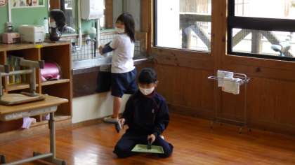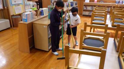 全校縦割りのスマイル班で掃除をします。1年生も一生懸命掃除をがんばっています。高学年の子が低学年の子に優しく教えています。頼もしいですね。
