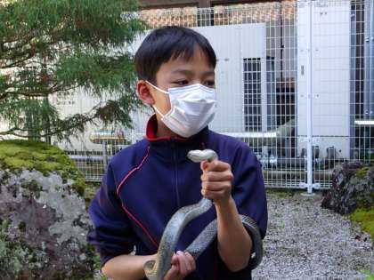 校舎内にへび(アオダイショウ)が来ました。