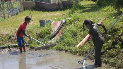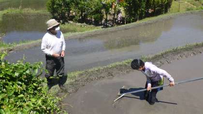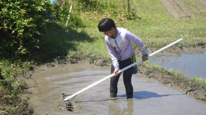 泥遊びが終わった後、5・6年生がしろかきをします。