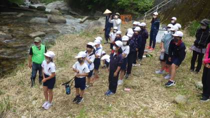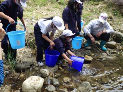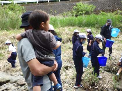 地域コーディネーターの方が地域の方に声掛けをしてくださり、7名ほど住民の方も来て一緒に放流しました。